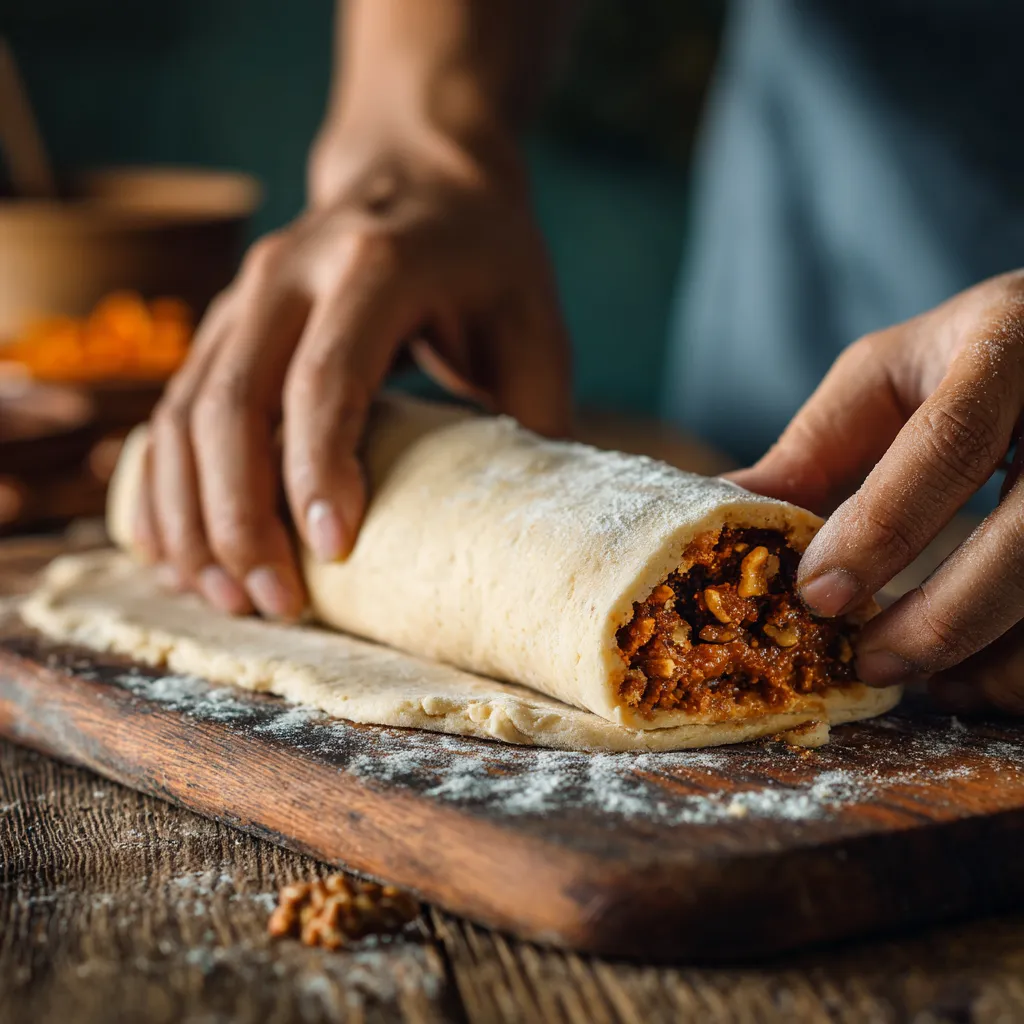 Roll the dough into a large rectangle (about 12×16 inches). Spread the filling evenly over the surface, leaving a small border. Gently roll the dough into a log and slice into 12 rolls. Arrange them in a greased baking pan.