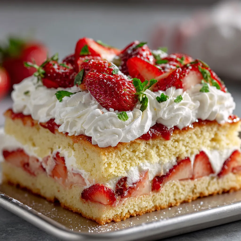 A soft, buttery vanilla sheet cake layered with fluffy whipped cream and juicy macerated strawberries this Strawberry Shortcake Sheet Cake is a simple yet elegant dessert that brings the taste of summer right to your table. Perfect for parties, family dinners, or cozy afternoons with coffee.
