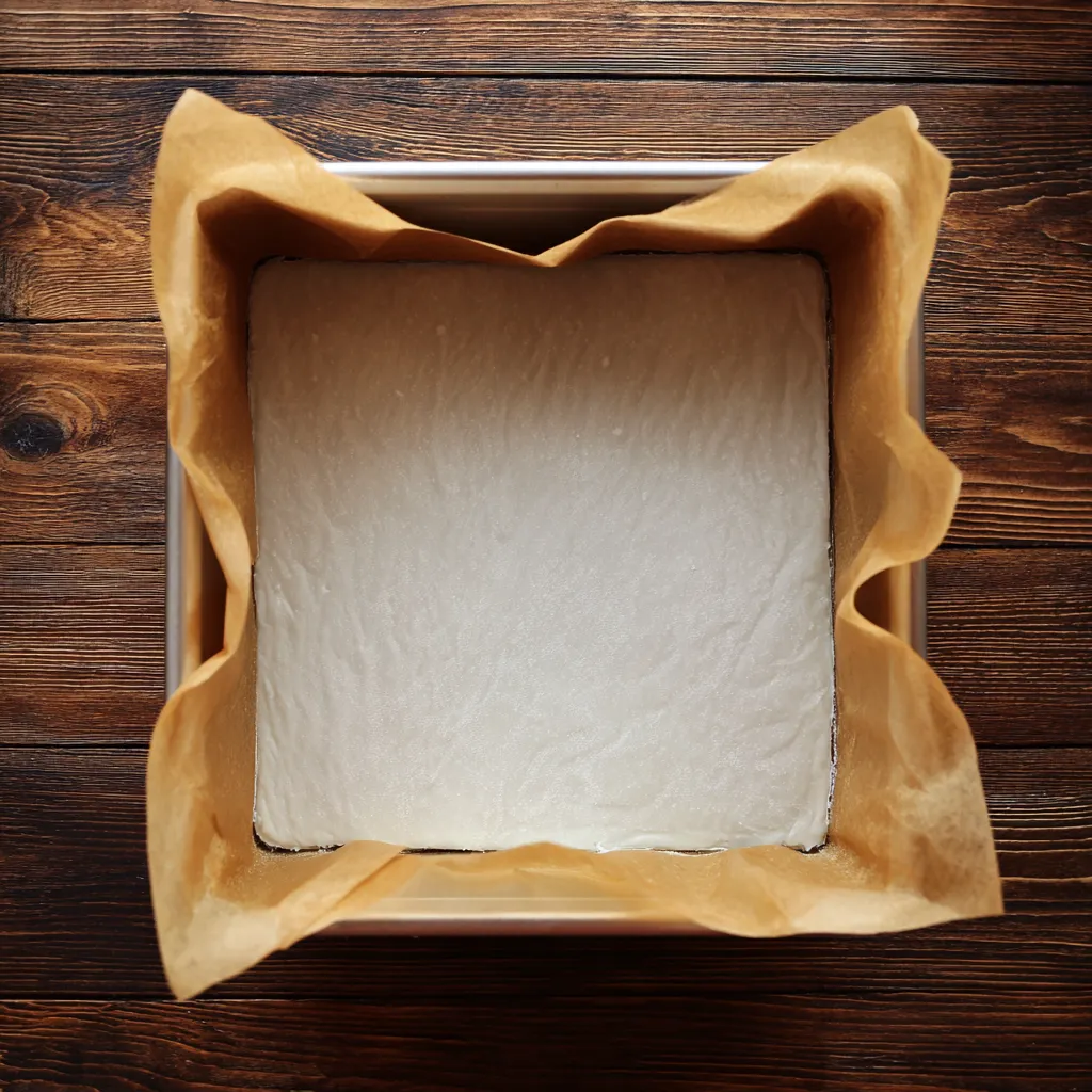 - Line an 8×8 pan with parchment paper.
