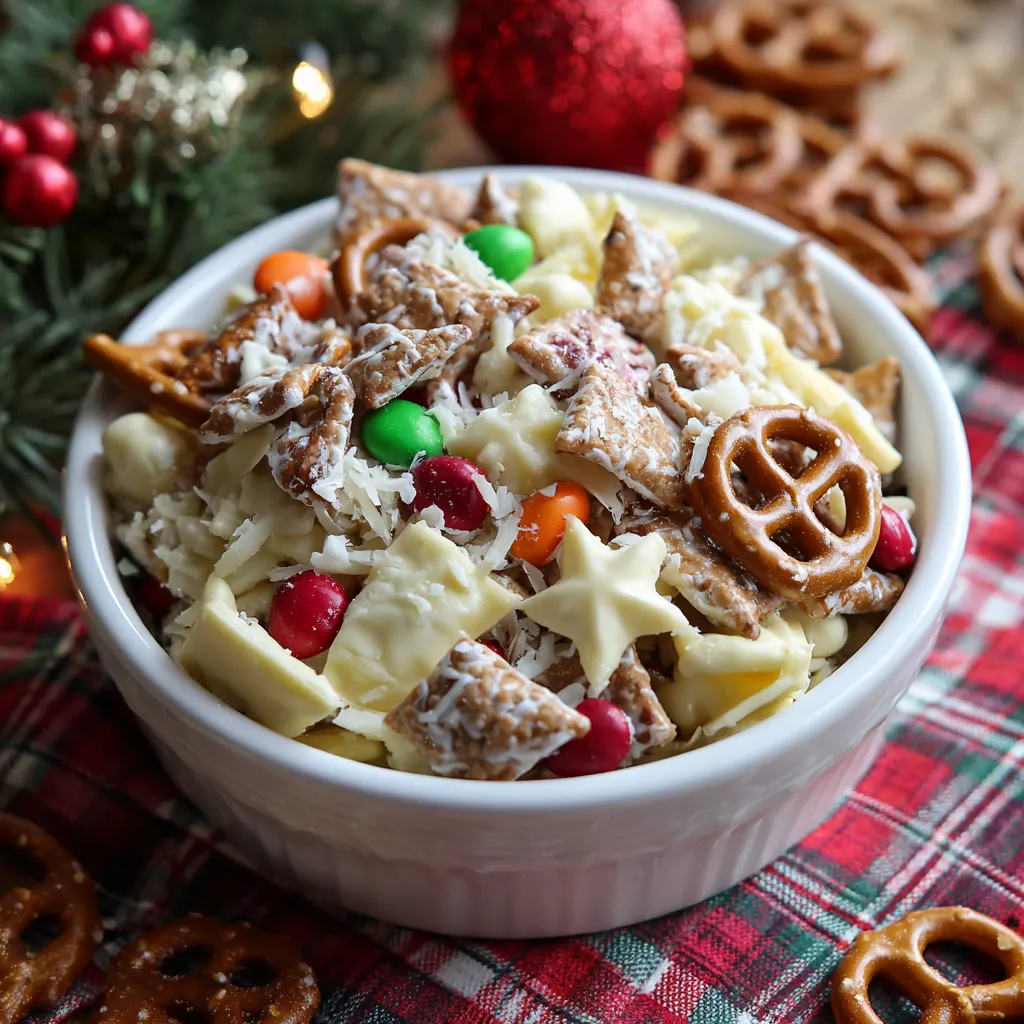 In a large bowl, combine the pretzels, Chex cereal, bugles (if using), marshmallows, M&M’s, and crushed candy canes. Toss everything gently so the mix is evenly distributed.