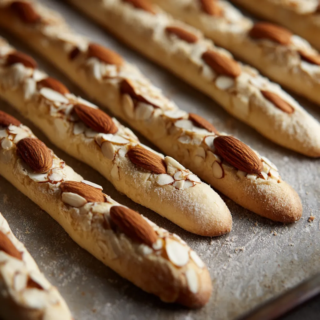 Preheat oven to 375°F (190°C). Punch down the dough and divide it into 20–25 pieces. Roll each piece into a thin breadstick shape, slightly tapered at one end. Press a whole almond into the tip for the fingernail. Use a knife to score small lines across the “knuckle” area for a realistic look. Place them on a lined baking sheet. Brush lightly with olive oil.
